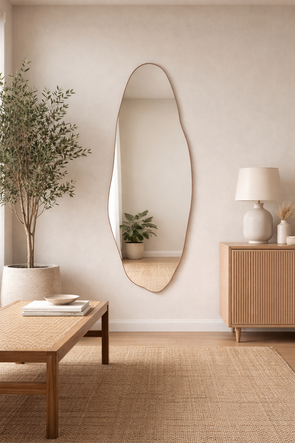 Versátil e atemporal, este espelho orgânico combina com diferentes estilos de decoração — do minimalista ao contemporâneo — tornando-se um destaque sutil e sofisticado em qualquer ambiente.