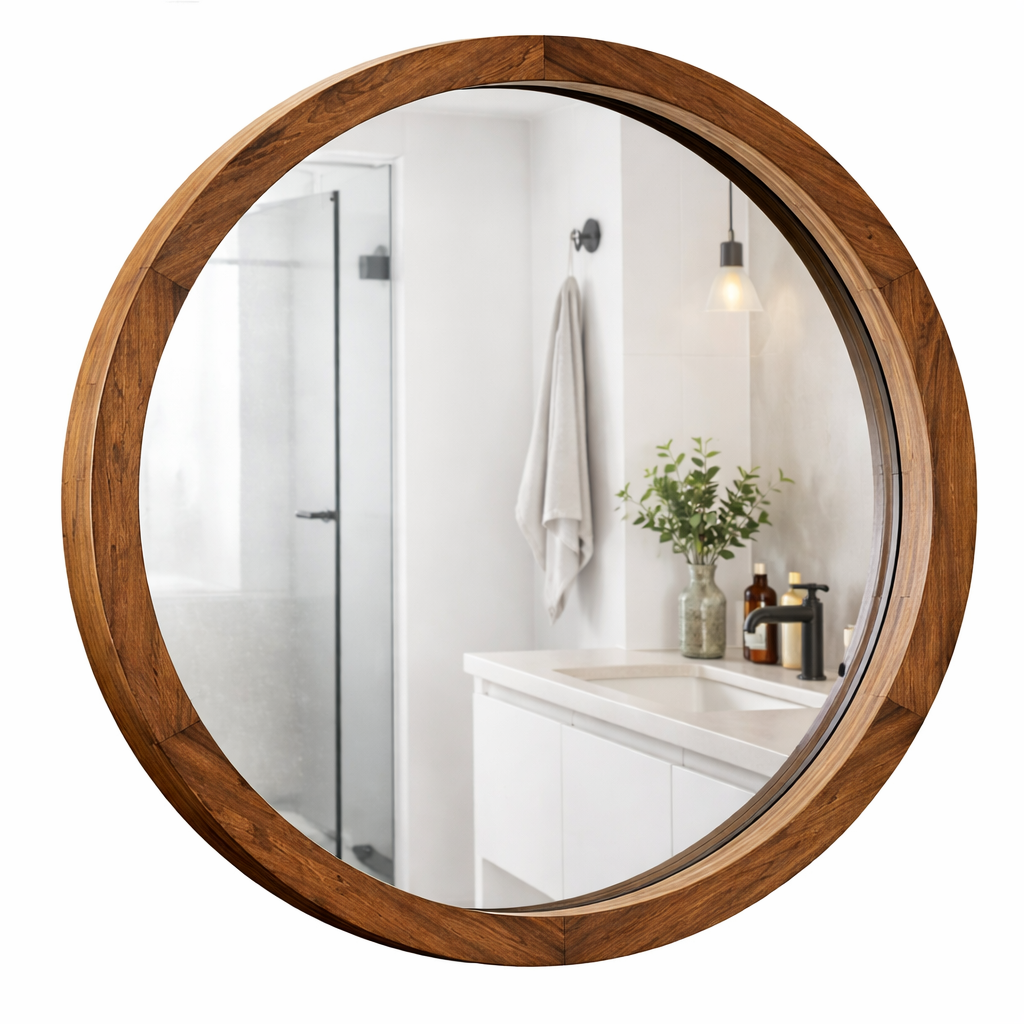 O espelho redondo 90cm de diâmetro com moldura em lâmina de Imbuia maciça é uma peça de destaque que une elegância atemporal e sofisticação natural.